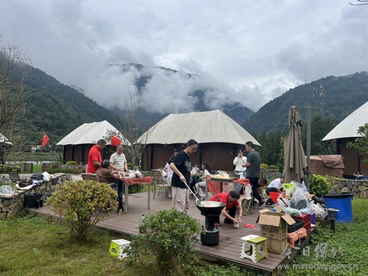 山林间的露营基地是初秋的“浪漫归宿”。一顶顶帐篷错落散布在草坪上,帆布在秋风中轻扬,灯串沿支架蜿蜒出温暖轮廓。游客们或忙着烹饪美食,或围坐在一起谈天说地,尽享假日漫时光。“这里没有城市的车水马龙,没有钢筋水泥的压抑,只有风声、水声、鸟鸣声交织成的自然乐章,能让人卸下所有疲惫,沉浸在山水之间。”来自罗江的游客曾坤一放假便带着孩子来到清平露营,这里迤逦的自然风景和绿色的农家美食,让他们流连忘返。