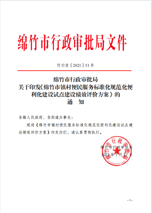 绵竹市 市行 行政审批 印发 竹市镇 镇村 便民服务 标准化 规范 试点 绩效评价