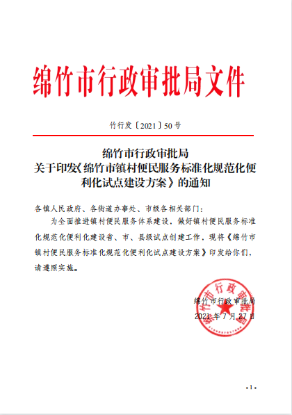 绵竹市 市行 行政审批 印发 竹市镇 镇村 便民服务 标准化 规范 试点 建设方案 的通知